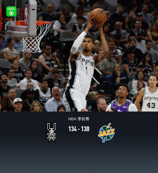 北京时间10月11日,在一场NBA季前赛中,圣安东尼奥马刺队对阵犹他爵士队。半场马刺72-55领先爵士,最终马刺134-130领先爵士。圣安东尼奥马刺队的文班·亚玛得到22分、7个篮板和3次助攻,大卫·琼斯得到20分、5个篮板和4次助攻。犹他爵士队的森萨博得到26分和1次助攻,小克莱顿得到20分、5个篮板和5次助攻。首节比赛,马刺队的文班亚马得到10分,爵士队的森萨博得到11分。首节战罢,马刺34-30领先爵士。第二节,马刺队的文班亚马得到12分,爵士队的艾斯贝利得到9分。半场结束,第三节马刺7比2-55领先爵士,马刺香槟拿下7分,爵士森萨布拿下9分。第三节结束,马刺95-90领先爵士。第四节大卫乔马刺拿下12分,爵士亨德里克斯得分八点。第四节马刺95-90领先爵士。加时赛马刺队122对122爵士队,圣安东尼奥马刺队的大卫·琼斯得到8分,爵士队的基安特·乔治得到2分。最终,马刺队以134-130击败爵士队。全场数据:圣安东尼奥马刺队文邦亚玛得到22分7助攻3助攻,大卫琼斯20分5篮板4助攻1抢断,瓦塞尔18分4篮板2助攻1抢断。犹他爵士队的森萨博得到26分1助攻2抢断,小克莱顿20分5篮板5助攻1抢断1盖帽,艾斯贝利20分7篮板1助攻2抢断。圣安东尼奥马刺队首发阵容:冯·班亚马、瓦塞尔、凯尔登·约翰逊、尚帕尼、哈里森·巴恩斯。犹他爵士队:艾斯·贝利、亨德里克斯、努尔基奇、坎特·乔治、米哈伊柳克。