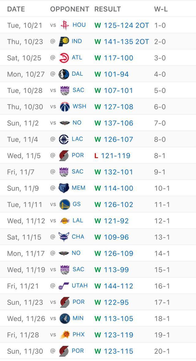 北京时间12月1日,雷霆队面对本赛季唯一一支获胜球队开拓者队,依靠第四节的关键进球以123-115击败他们,豪取12连胜。本赛季结束后,雷霆队本赛季的战绩为20胜1负。他们成为NBA历史上第四支在前21场比赛中赢下至少20场的球队。雷霆队本赛季没有首发大个子哈滕施泰因。由于右小腿比目鱼肌拉伤,他将缺席接下来的 10 到 14 天。不过,在上一场加入杰伦·威廉姆斯之后,雷霆队的阵容有所改善。本场比赛雷霆队六名球员得分上双。除了得到26分的亚历山大之外,杰伦·威廉姆斯得到16分、8个篮板和5次助攻,霍姆格伦得到19分和9个篮板。米切尔和以赛亚·乔也替补出场合计得到32分。统计显示,NBA历史上有三支球队在前21场比赛中至少赢了20场比赛赛季最精彩的几个赛季:2015-16 赛季勇士队、1993-94 赛季火箭队和 1969-70 赛季尼克斯队。最终火箭队和尼克斯队获胜。勇士队赢得了73场比赛,为常规赛历史上最多的胜利,但在总决赛中被以3-1领先的骑士队击败。 (焕仁撰)