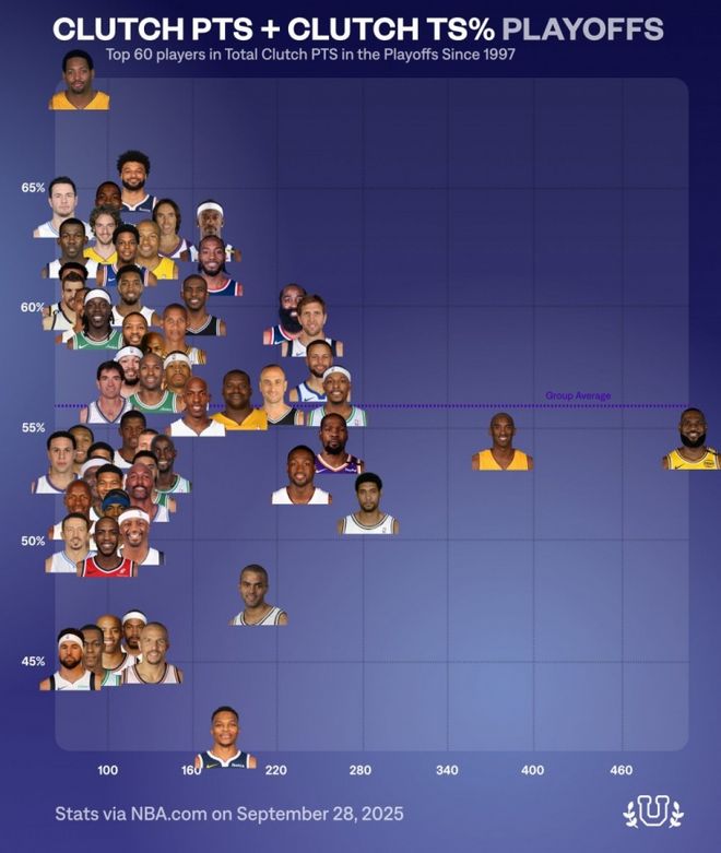 9月29日。他从著名的NBA媒体大学启动了统计数据,并从1997年到现在同时推出了60名最佳球员。从1997年到现在,我们写下并简化了季后赛的关键时刻,但我们可以找到许多现象。詹姆斯真的很令人惊讶。詹姆斯(James)是季后赛中关键时刻的第一个历史上的第一个,超过了该坐标的水平轴的最大参考(460点),而其他球员的水平轴则少于400分,詹姆斯(James)获得了460分以上,整个头像越过坐标。 Westbrook也充满了坐标,但由于效率低下,它是垂直轴上唯一的水平。科比的得分不如詹姆斯好,其效率不如詹姆斯好。在季后赛中,他有许多队友。包括O'Neal,Horry,Fisher,Gasol,Nash,Howard。您可以看到您的科比队友有多大的能力来获得EmpertaNT目标。您不会说O'Neal总是可以掌握游戏。您不必说Holly是一个名为“ Key Mr.”的冠军。它的效率是第一个,其产量不是很好,但实际的政变率为70%。霍华德(Howard),纳什(Nash),加索尔(Gasol)和费舍尔(Fisher)效率约为65%。您甚至可以看到神户的大腿有多厚,甚至没有看到重要的时刻。他不是说奥尼尔是历史上最主要的球员。加索尔(Gasol)是2010年的皇家FMP,由韦德(Wade)公开认证。韦德知道,许多人在2010年决赛中令人担忧,而加索尔是2010年的真正FMVP。费舍尔用铃铛击败了马刺。此外,还有bynum,Artes,Ariza,Odom和其他大腿。他们并没有在关键时刻获得前60名,但是当科比和Artst赢得了最后的胜利时,他们都在关键时刻踢球。