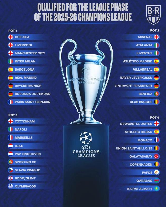 今天凌晨,2025-26冠军联赛的季后赛结束了,主要比赛的36支球队接管了比赛。 8月29日,星期五,00:00,北京时间,将举行Mónaco领带仪式,以确定每个球队在联赛阶段需要面对的八个对手。 Iqiyi Sports将是独家直播。在抽奖活动之前,根据UEFA的联系,将36支球队分为四个级别,每个级别的9个球队都在卫冕冠军Paris Saint-Germain自动成为第一个种子团队。冠军联赛的36支球队如下:第一级:巴黎圣日耳曼,皇家马德里,曼城,拜仁慕尼黑,利物浦,国际米兰,切尔西,切尔西,多特蒙德,巴塞罗那。第二层:阿森纳,勒巴库森,马德里,本菲卡,亚特兰大,比利亚雷亚尔,尤文图斯,法兰克福,布鲁日。第三级:托特纳姆热刺,埃因霍温,阿贾克斯,那不勒斯,葡萄牙运动,奥林匹亚人,斯拉维亚·布拉格,鲍德辛,马赛。第四级:哥伦Hagen,Monaco,Galatasarei,Sangiros United,Carabach,Athletic Bilbao,Newcastle,Paphuos,Almatikayratt。其中,六支英超联赛球队参加了比赛。联盟,A系列和德甲联赛中各有四支球队。 Ligue 1的三支球队分别是荷兰英超联赛和超级葡萄牙超级联赛的两支球队,以及两个超级联赛,捷克英超联赛,希腊超级联赛,北欧超级联赛,丹麦超级联赛,阿塞拜亚超级联赛,塞浦路斯塞浦路斯,塞浦路斯联赛和哈萨库超级联赛。纽卡斯尔(Newcastle)和比利亚雷亚尔(Villarreal)完成了英超联赛和拉利加(Laliga)的其他位置,例如上赛季欧洲冠军最佳积分的两个联赛。托特纳姆热刺将成为欧罗巴联赛冠军。 Paphuos,Bord Shining和Almati Kayratt是第一个加入的人。在MMPOS联赛进行改革之后,欧洲联盟采用了自动领带。首先,您可以手动绘制参与的团队并使用计算机程序吸引八个不同的Oppon从第一到四个级别,每个级别的两个团队,一个在家中的团队,一个独立的团队。抽奖始于第一次3月,彼此分配了36支球队。在联盟阶段,需要许多平局遵循联盟之间相同的逃避原则。这意味着一个球队无法与同一联盟中的另一支球队竞争,只能提取两个对手。有了这一规则,联赛赛季的所有第一支球队都不会再私人了,无疑将在联赛舞台上面对两支英超联赛。本赛季总共有六支英超联赛球队参加了冠军联赛,其中三支首先是分类的,但不能相互竞争。阿森纳在第二个3月,在3月第四次马尔凯德纽卡斯尔的托特纳姆热刺无法吸引平局中的第一支英超联赛球队。彩票规则和以前的回避原则也适用于欧罗巴联盟,但该过程略有不同。与冠军不同S联赛,您在那里手动绘制36支球队并一一分配对手,欧罗巴联赛会产生球队的所有对手以及在家中的安排和访客,并完全自动自动自动宣布他们的资格。欧盟有36个球队分为6个级别,每个团队都有1-2个对手,1位主持人,1位对手,1位主持人和1位主持人,1 5-6个对手,1位主持人,1个主持人,1位主人,1个主持人,1个主持人,1个主人,1个主人,1个主人,1个主持人,1个团队,1个团队。回避的原则与冠军联盟和欧盟的原则相同,彩票过程与同时产生的UnióprocessEeuropeann相同,并以很多方式出版。 。早晨抽奖将由前UEFA新闻官Pedro Pinto组织,并将由UEFA总裁Ceferin提出,参加演讲者奖和其他奖项。抽奖完成后,每个团队只能决定其对手,而不是日期D的开始时间。 Special is expected that the scheduled schedule will be announced by UEFA before August 30. The Basic League Stage Schedules That Can Be Decided at the Moment Are As Follows: Round 1: 16-18, 2025 Round 2: September 30, 2025 - October 21/22 Round 3: 2025 Round 4: November 4/5, 2025 Round 5: 2025 Round 6: December 6, 20/21, 2026 Round 8: 2026 Round 8: 2026 Round 8: 2026年1月28日,日本赛季冠军联赛决赛将于2026年5月30日在匈牙利布达佩斯的Puskas Arena举行。